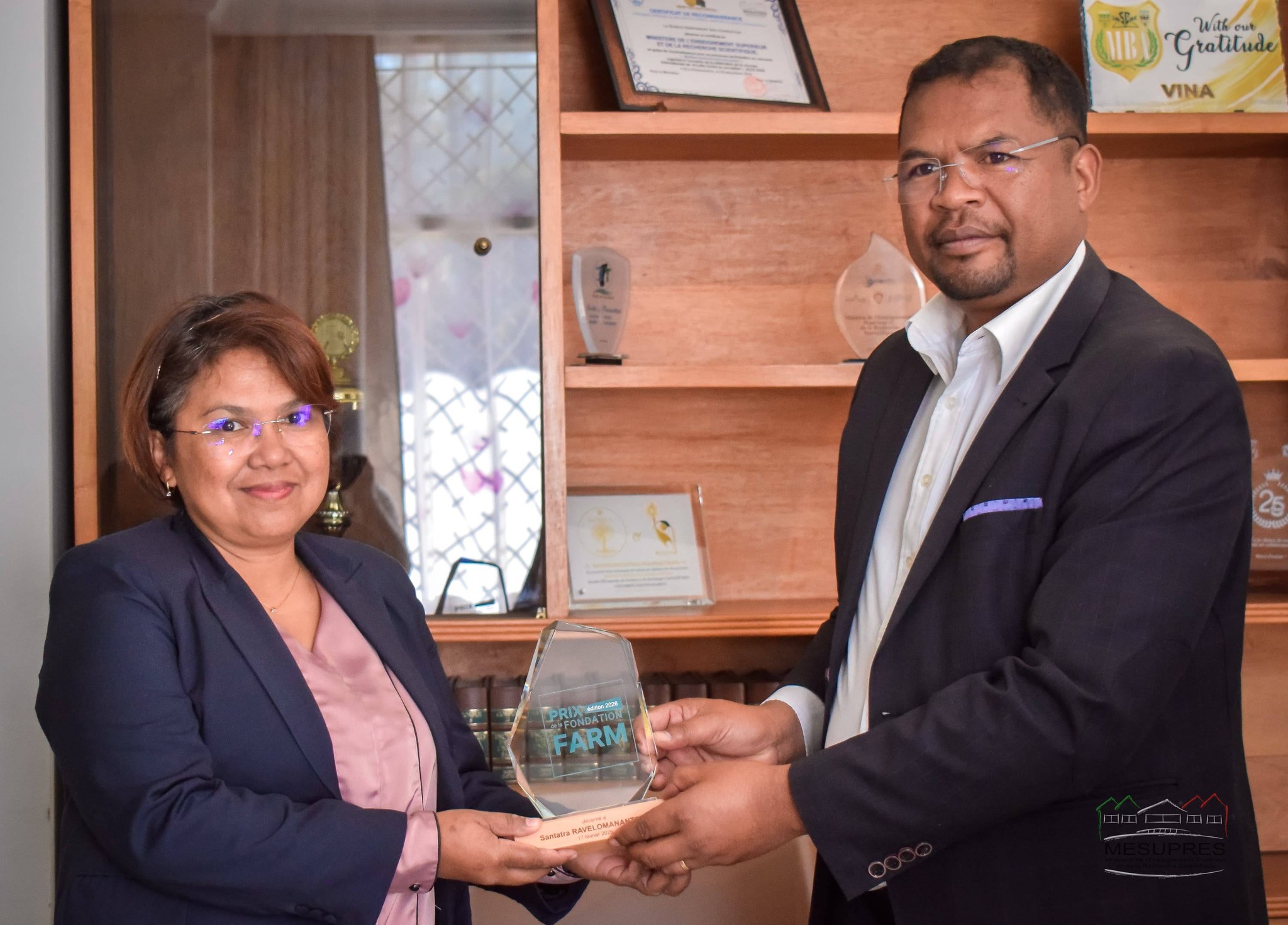 Noraisin’ny Minisitry ny Fampianarana Ambaratonga Ambony sy ny Fikarohana Ara-tsiansa, Pr RAVONIMANANTSOA Ndaohialy Manda-Vy, teto Fiadanana , ny 15 Aprily 2026, ny Dr RAVELOMANANTSOA Santatra, mpikaroka-mpampianatra sady Lehiben’ny Sampana Fikarohana Ara-pambolena ao amin’ny FOFIFA, izay nandrombaka ny loka “Fondation FARM 2026” tany Paris ny 17 febroary 2026.